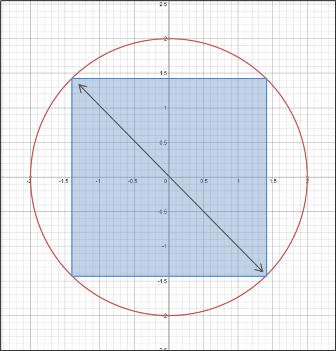 is a circle with radius 2. Through intuition, the largest area will occur when there is a square placed inside the circle with vertices that touch the circle. Hence the diagonal of the square will be equal to the diameter 4.