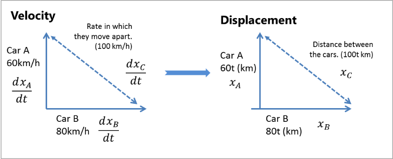 So the rate in which they are moving apart, regardless of time is a constant 100km/h. If both cars are moving away from the intersection at a constant rate, the velocity between them should also be constant.