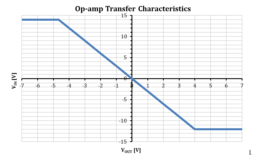 In the transfer characteristic graph, this would occur when the input voltage is below 3V or above 5V. We can see that even if we input 1V, we still get a 4V output, same with 2V and 3V.