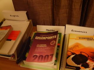 I study in my sister's room (although she lives in Canberra now so it's a spare bedroom). And I don't make piles of my work because I only have one huge folder for each subject so I like to keep them at school. I'll think about taking a pic of my room.